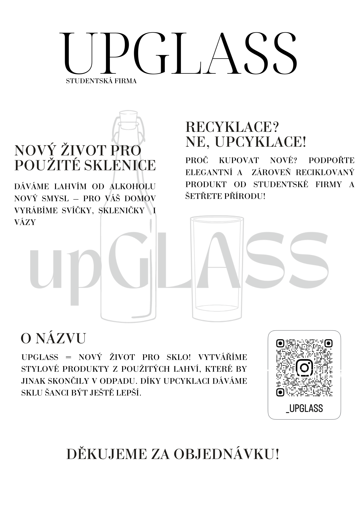 07/2025 Studentská firma upGLASS tímto oficiálně ukončuje svou činnost v rámci školního roku 2024/2025. Projekt byl zaměřen na upcyklaci skleněných lahví a jejich přeměnu na funkční a estetické výrobky. Naším cílem bylo propojit udržitelnost, design a podnikatelské dovednosti.
