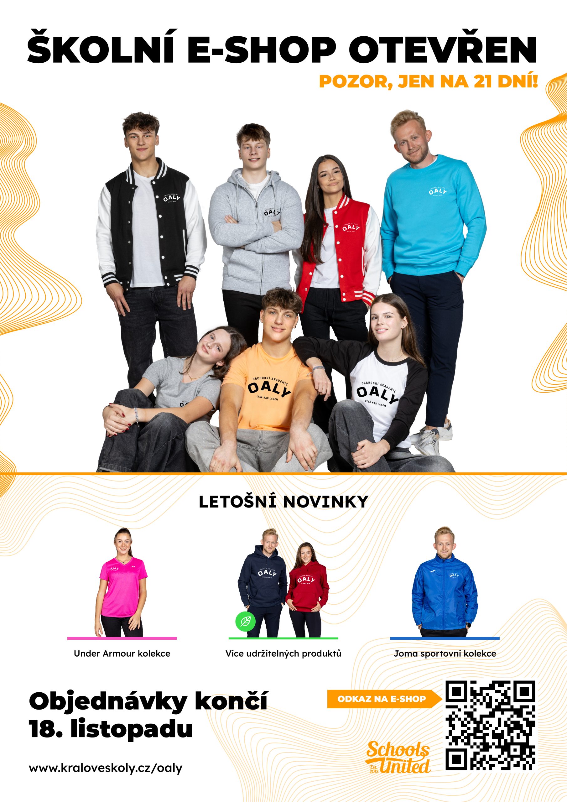 Máme pro Vás skvělou zprávu. Naše škola má vlastní volnočasovou kolekci oblečení plnou mikin, triček, batohů, čepic a dalších kousků se školním logem. E-shop je znovu otevřen a letos obsahuje mnoho novinek! Nabídku najdete na tomto odkazu: https://www.kraloveskoly.cz/oaly/